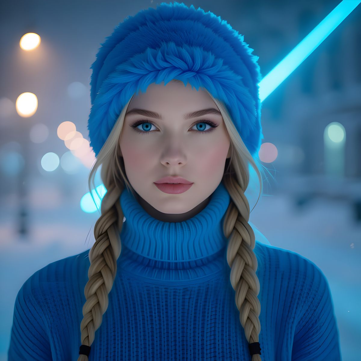 This image features a hyperrealistic portrait of a young woman with blonde braided hair and blue eyes. She wears a blue turtleneck and Russian hat, set against dark fog illuminated by a striking blue laser beam.