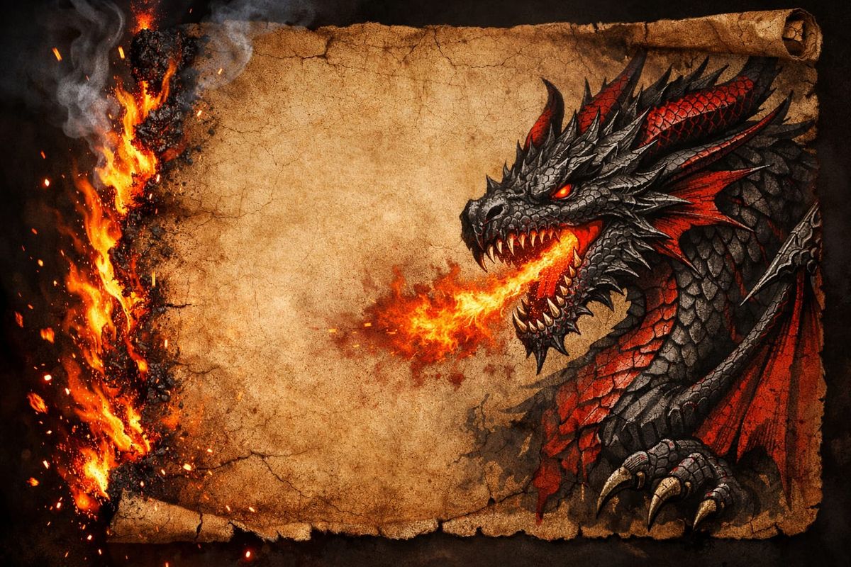 This image depicts an ancient, burning parchment scroll with a detailed illustration of a fierce red and black dragon. Flames and smoke consume the left, while the dragon breathes fire on the right in a dramatic fantasy style.