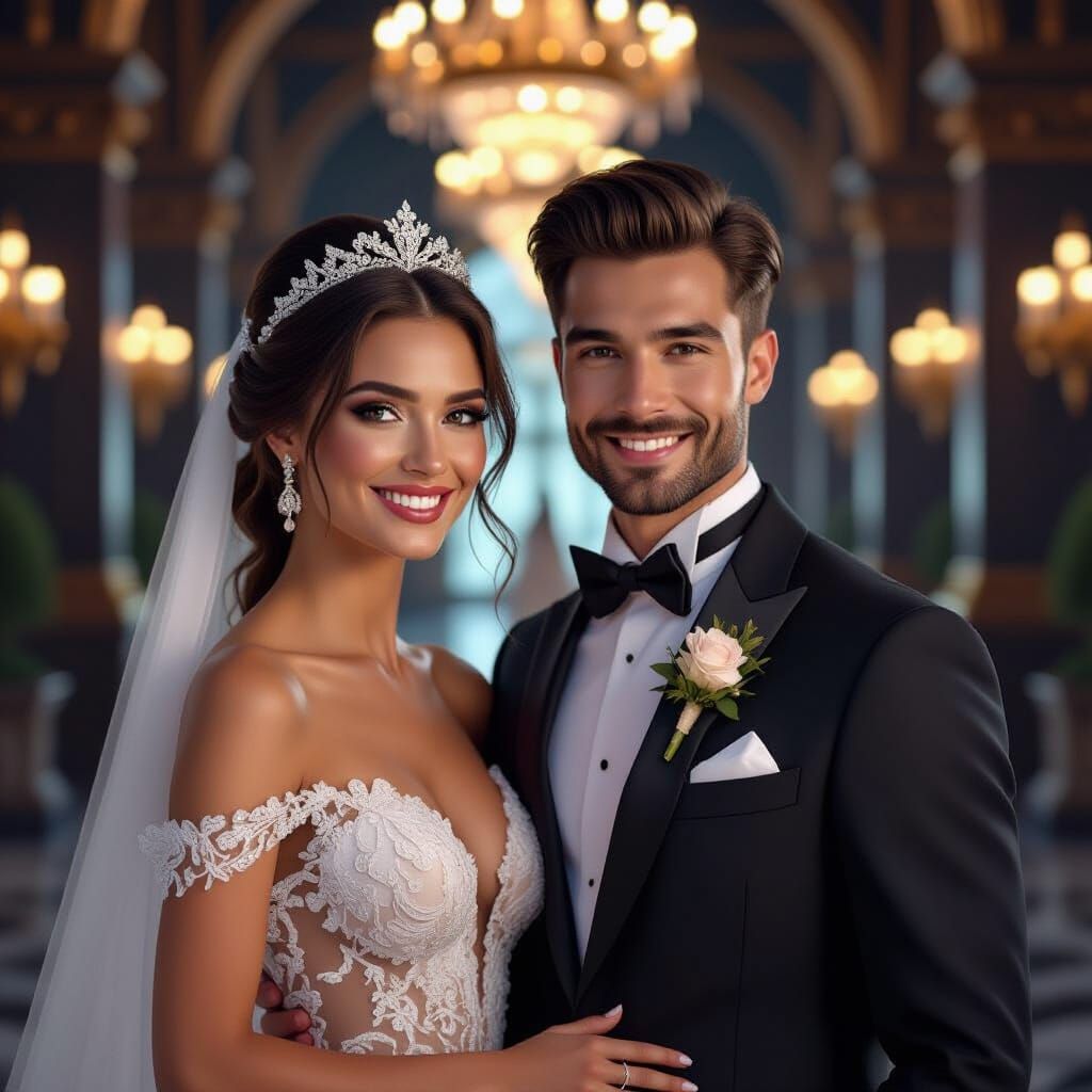 This image shows a portrait of a couple smiling, dressed in formal attire, posing in front of the Musée Maritime de La Rochele. The image has a fantasy realism aesthetic and vibrant colors.