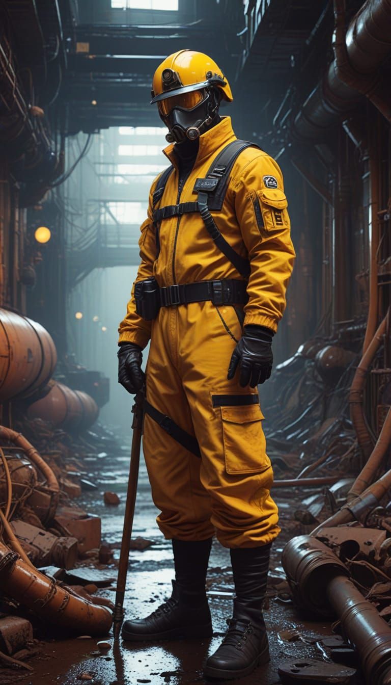 This image shows a dimly lit, sci-fi settlement with a grimy maintenance worker repairing a pipe. Inspired by industrial futurism and retrofuturism, it features dramatic lighting, worn textures, and a blend of dark and bright colors.