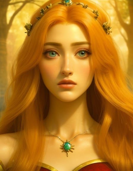 This image shows a stunning portrait of a goddess with the face of a young woman, reminiscent of a Renaissance art style, with delicate features and a gentle expression.
