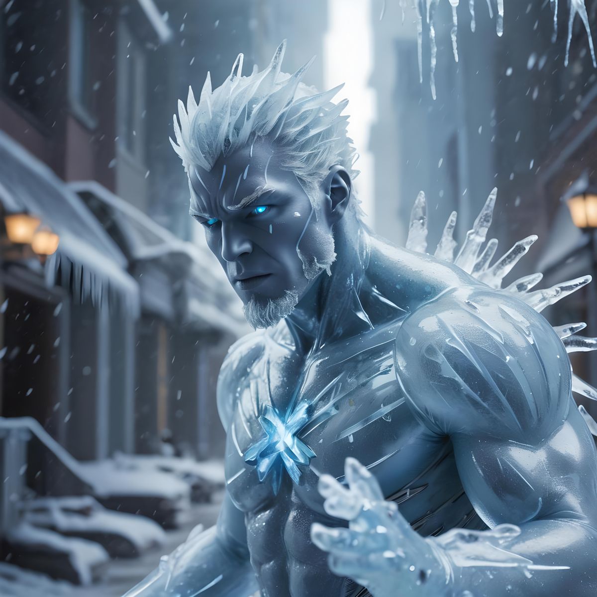 This image shows Iceman of the X-Men completely in his ice form, with sharp icicles covering his body and glowing blue eyes. A blizzard surrounds him, completing the frozen scene.