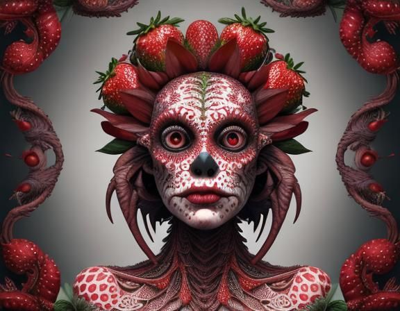 A striking picture of a cute strawberry monster girl with floral patterns. The hyperreal portrait showcases a grotesque yet beautiful creature.