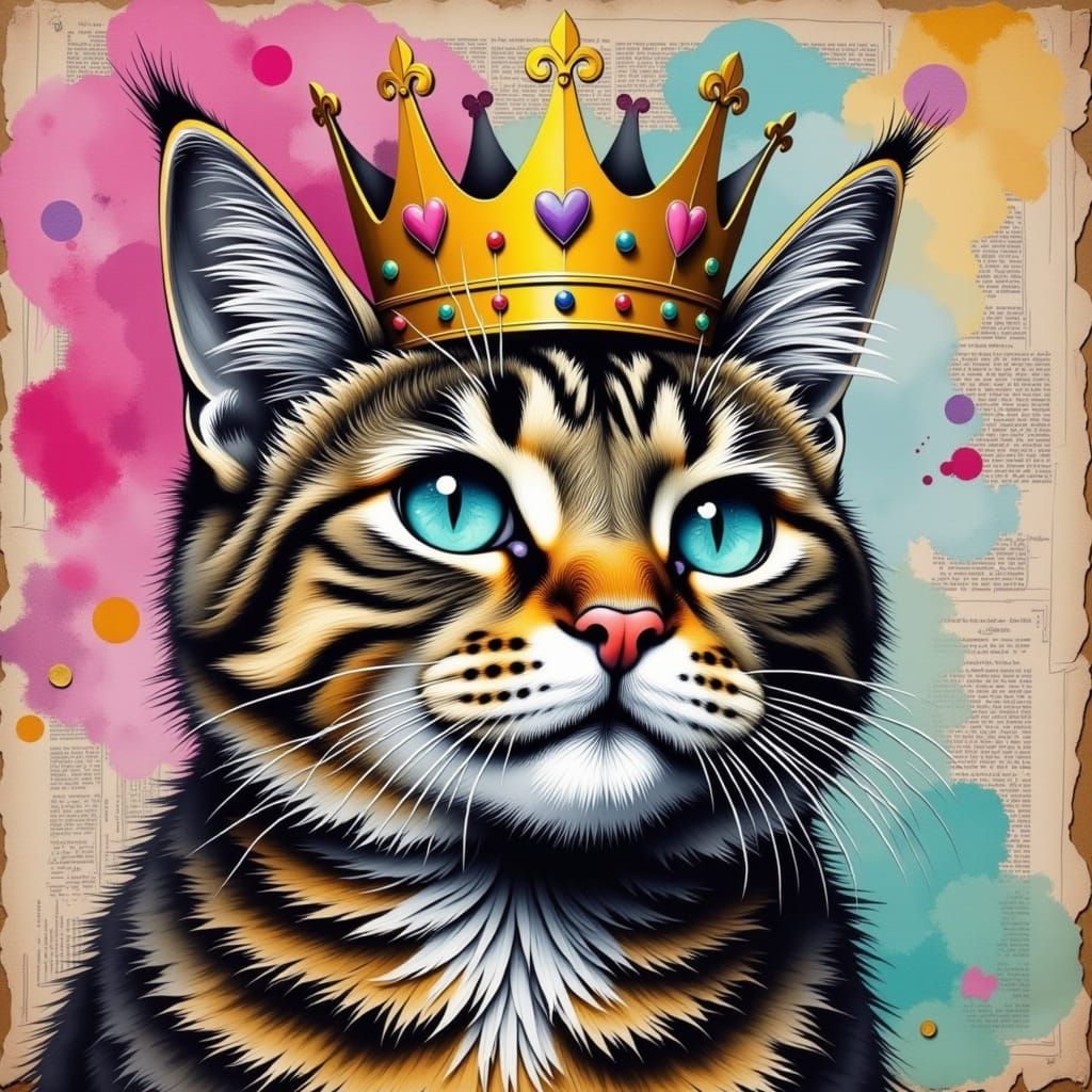 A striking mixed media portrait of a tabby cat with vibrant aqua eyes, wearing a golden crown adorned with playful shapes. The background features an abstract graffiti wall with paint splatters and textured layers.