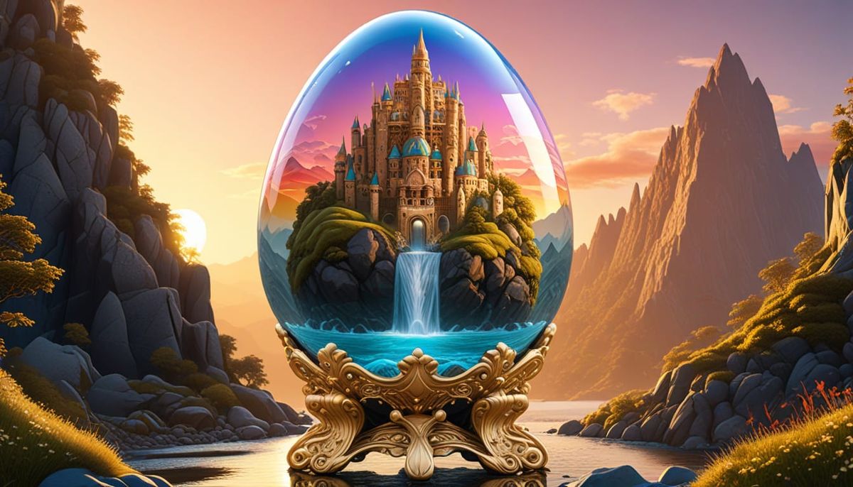 A striking picture of a Fabergé egg opening to reveal a mountain landscape with a castle and waterfall. The artwork features intricate patterns, fractal details, and vibrant colors, reminiscent of surrealist fantasy art.