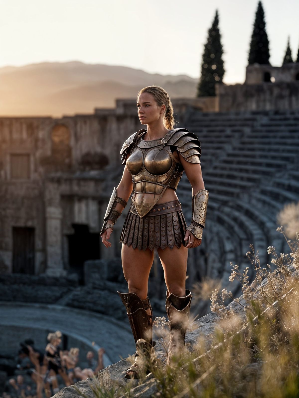 This image shows an athletic female gladiator in a crumbling Roman amphitheater at sunset. Her bronze armor gleams in the golden light, contrasting with blooming wildflowers and a serene landscape.