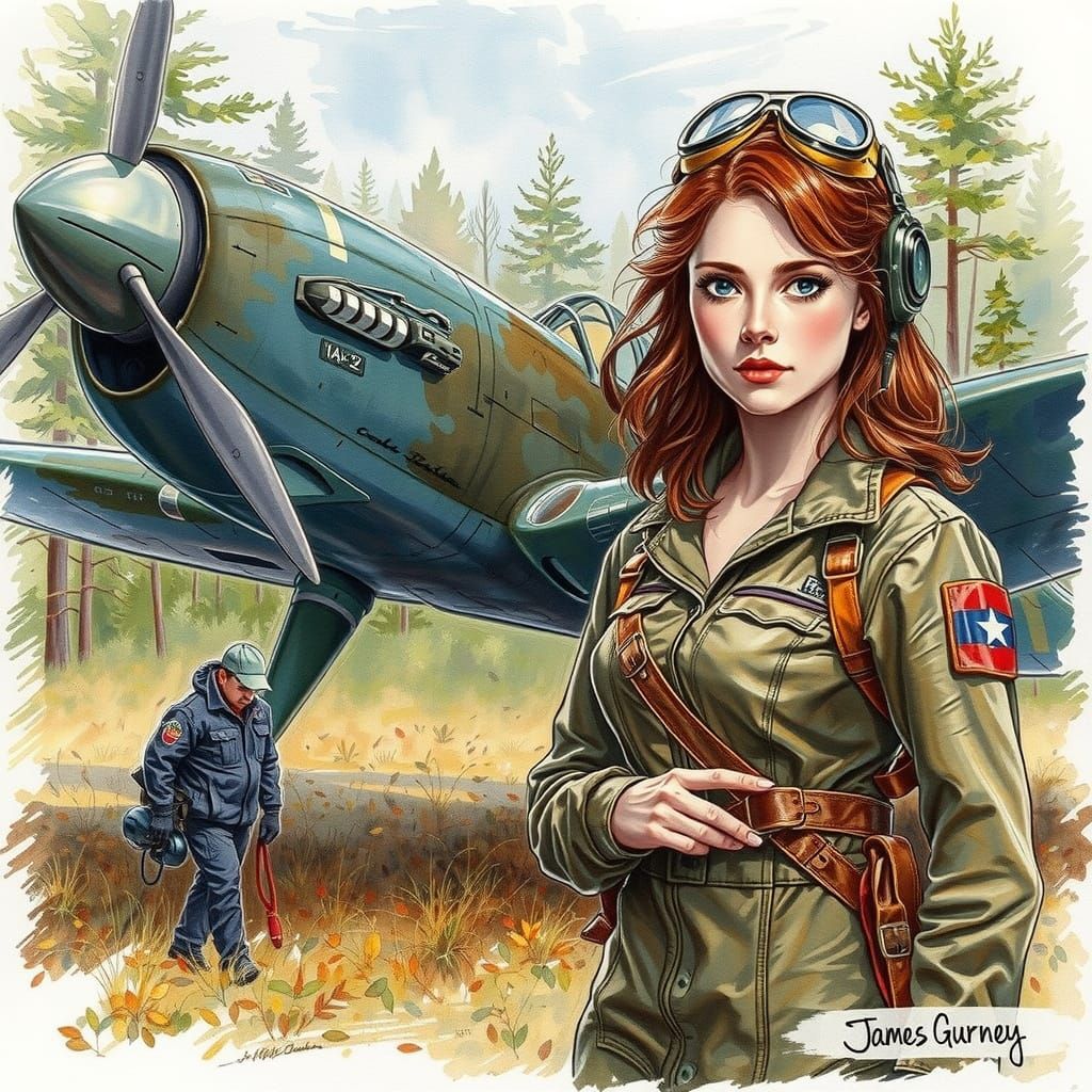 This image shows a determined female pilot of the USSR standing next to a vintage plane in a forest, assisted by a mechanic, in a warm and atmospheric oil-painted style with sfumato watercolor textures.