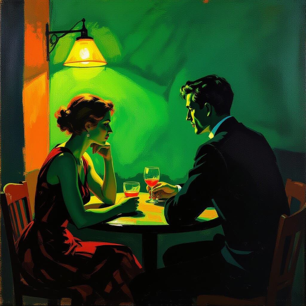 This image shows a vibrant, colorful, abstract interpretation of a night scene. The artwork features clashing neon green and orange hues reminiscent of expressionist paintings.