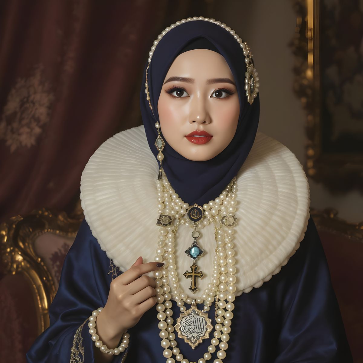 This image shows an Asian woman in an elegant hijab, wearing layered necklaces including pearl, cross and Arabic pendants. The image is detailed with soft, warm lighting, as a digital painting.