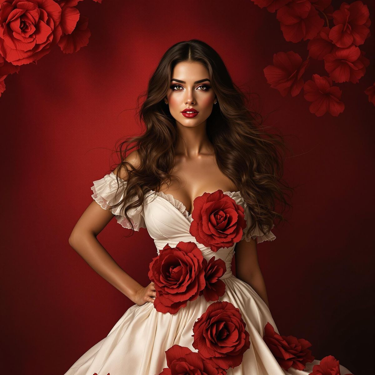 A stylish woman in a rose-petal dress poses against a gradient backdrop. The image features warm studio lighting, elegant textures, and a bold, passionate aesthetic reminiscent of Art Nouveau.