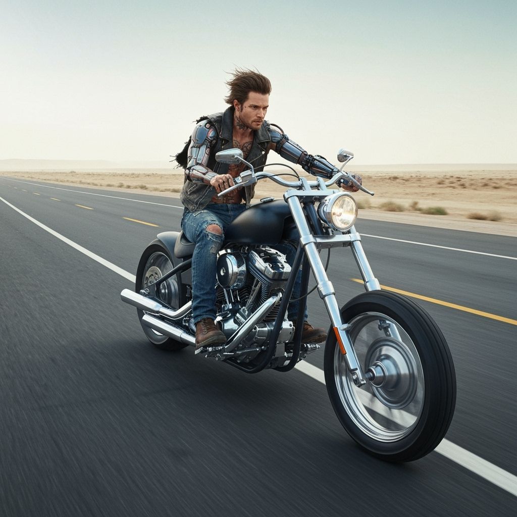 A striking picture of a falcon biker with tribal tattoos and a cybernetic arm riding a custom chopper on an asphalt highway. The artwork blends cyberpunk futurism with gritty realism in a desolate landscape.
