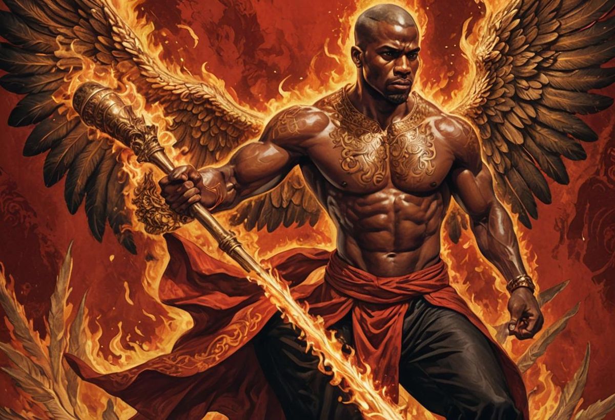 A striking picture of a muscular man with a shaved head holding a flaming torch. He has fiery wings and stands against a bold red backdrop in a baroque style.