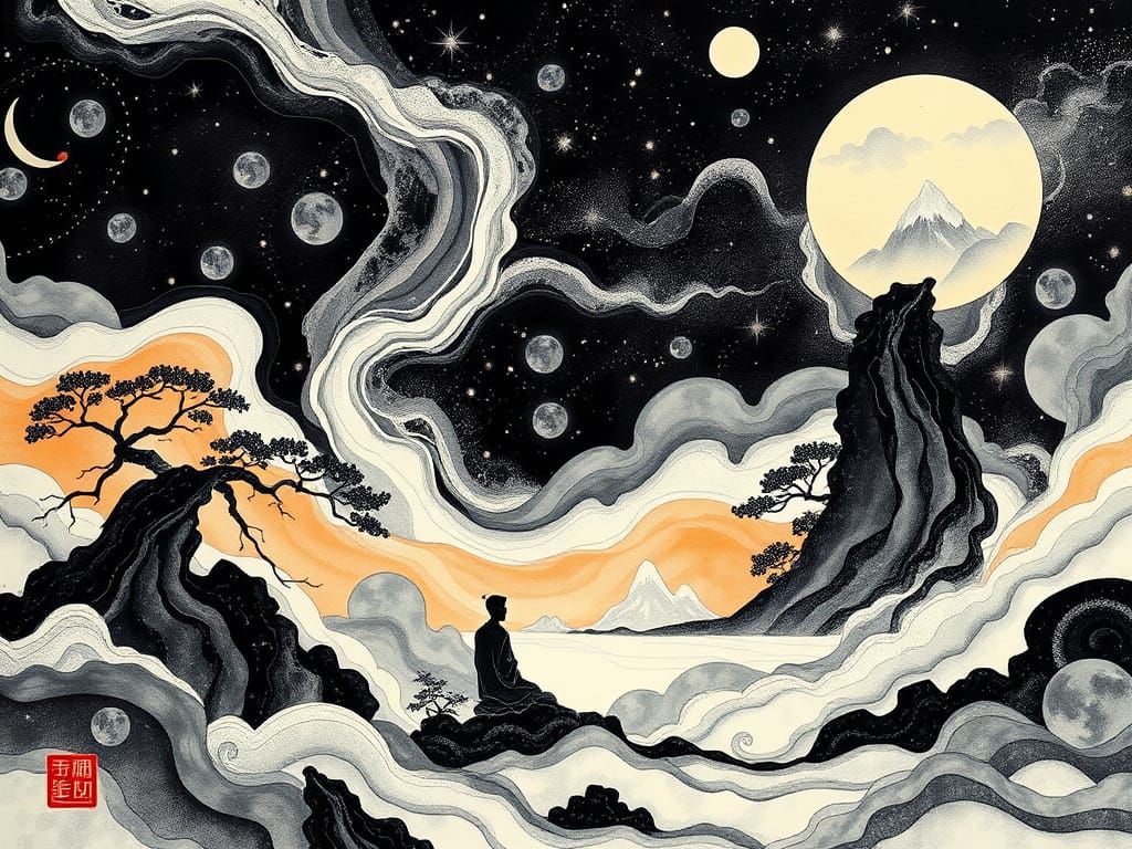 This image depicts a surreal, psychedelic journey through the universe, rendered in the expressive black ink style of Japanese Sumi-e painting with organic textures and symbolic motifs.