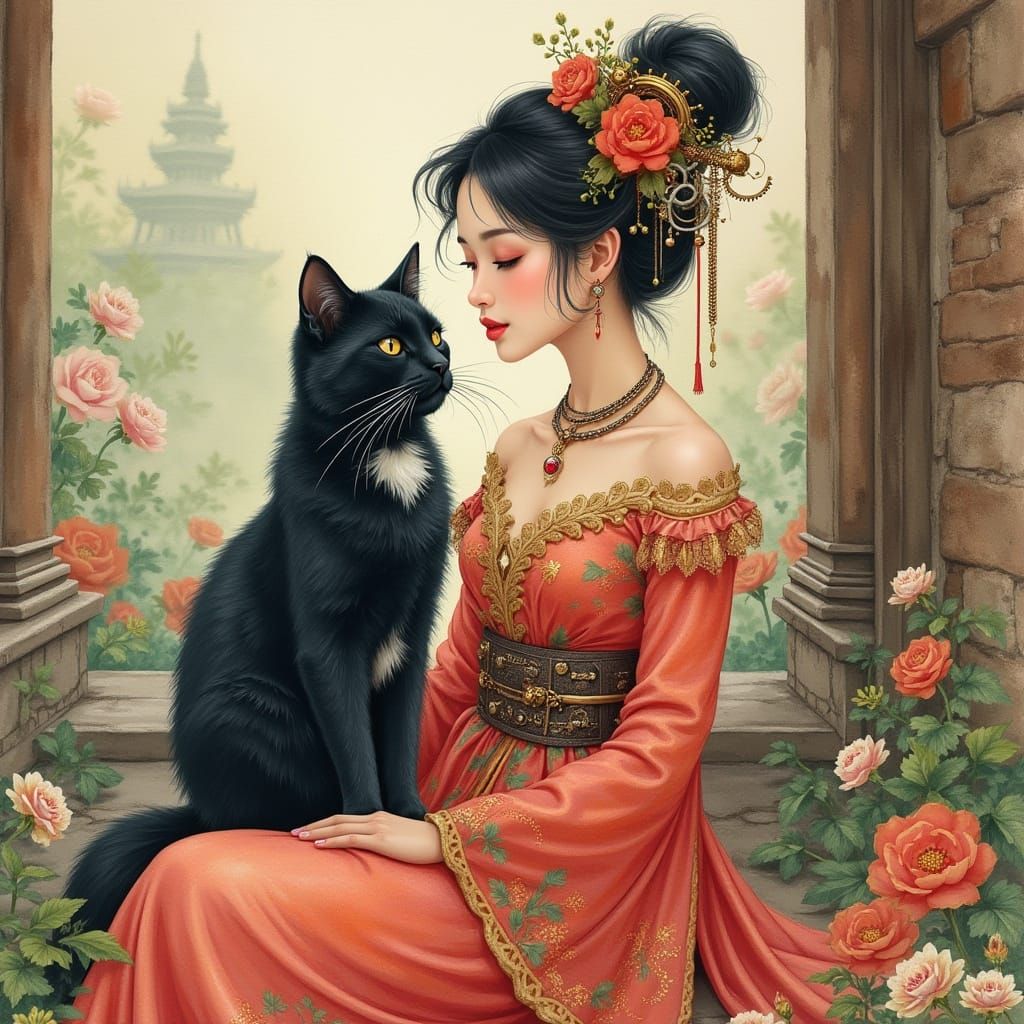 A watercolor of an Asian princess with a black cat amidst temple ruins. The fantasy illustration features steampunk elements and a soft pastel color palette.