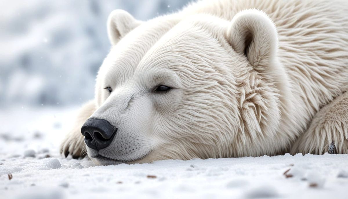 This highly detailed, photorealistic image shows a cute white bear sleeping peacefully on snow. Shot with a DSLR and natural lighting, it creates a cozy and serene atmosphere with sharp focus on the bear's face.