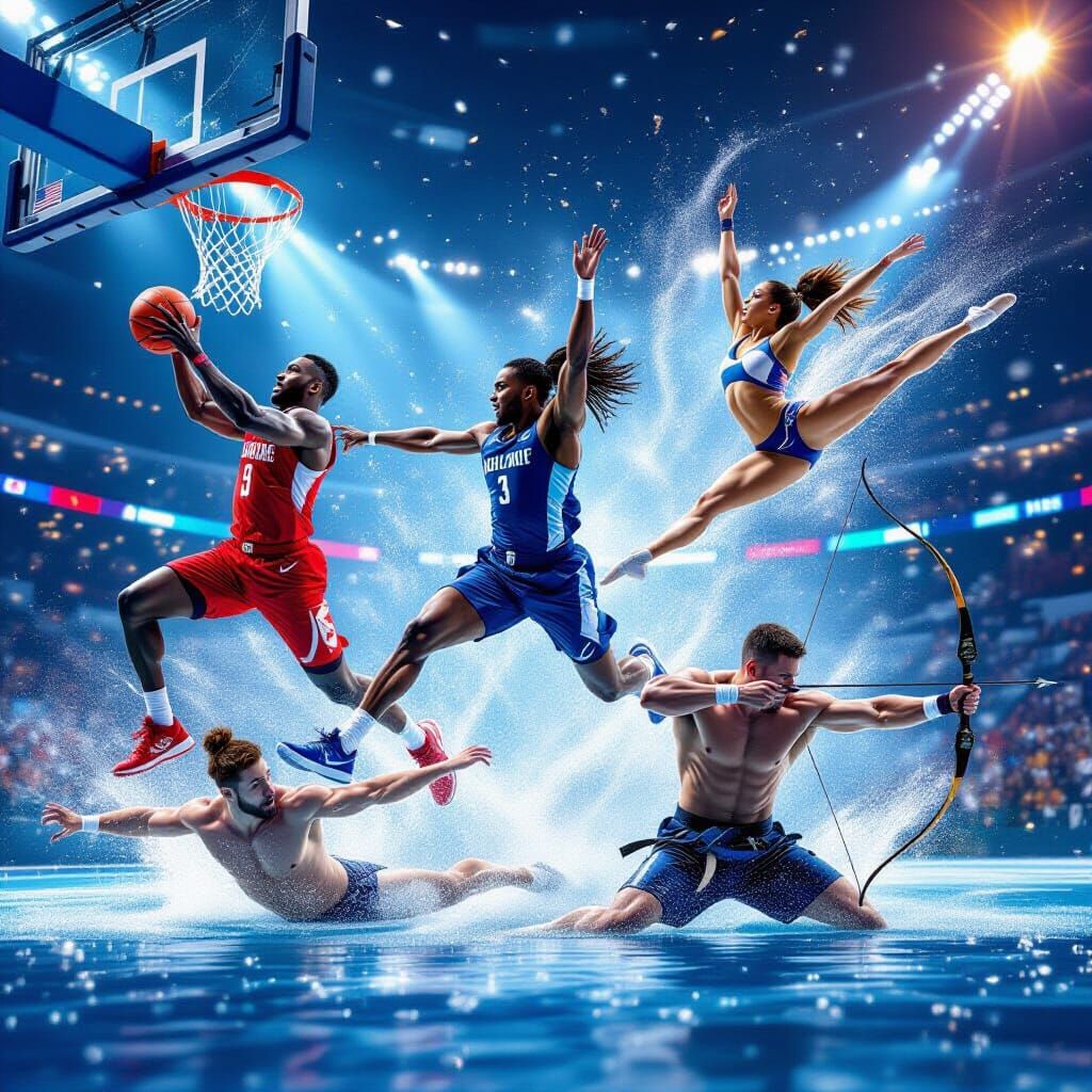 This image showcases a vibrant montage of athletes in various sports, including basketball, gymnastics, swimming, martial arts, and archery. Photorealistic style with dramatic lighting captures the intensity of each activity.