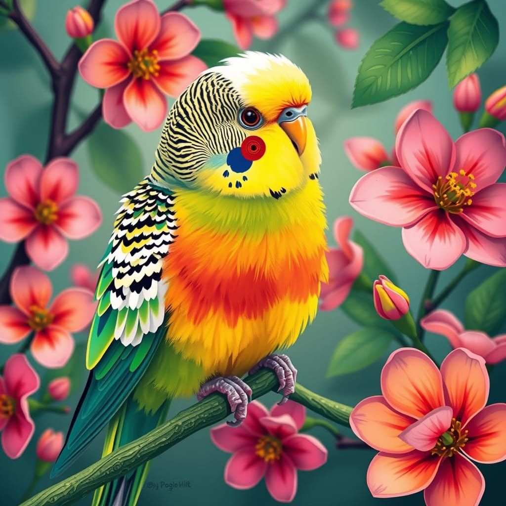 A vivid image of a budgerigar on a branch amidst flowers. The artwork blends pop art with impressionism, creating a vibrant and colorful scene.