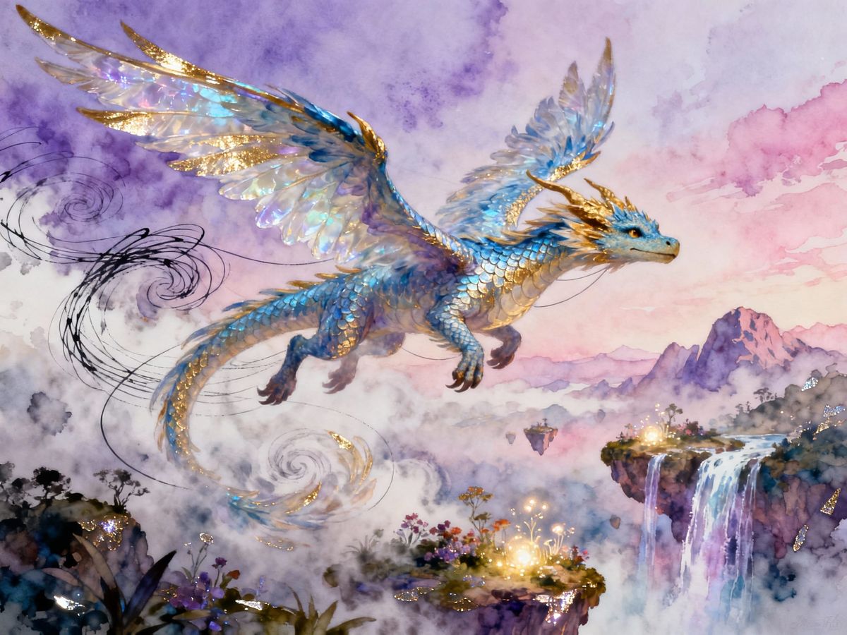 This image shows Falkor the Luck Dragon in an enchanting, otherworldly landscape with a dreamy, hypnotic style. Created with watercolor and ultra-realistic detail.