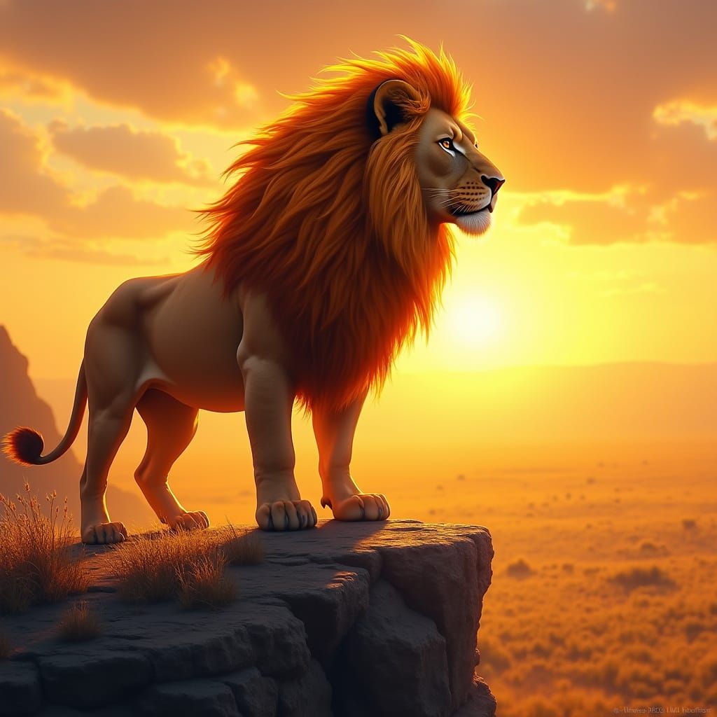 This image captures a regal lion with a fiery mane on a cliff, overlooking a savanna at sunset. It features photorealistic textures, vibrant colors, and dramatic lighting, evoking elegant lines and atmospheric style.