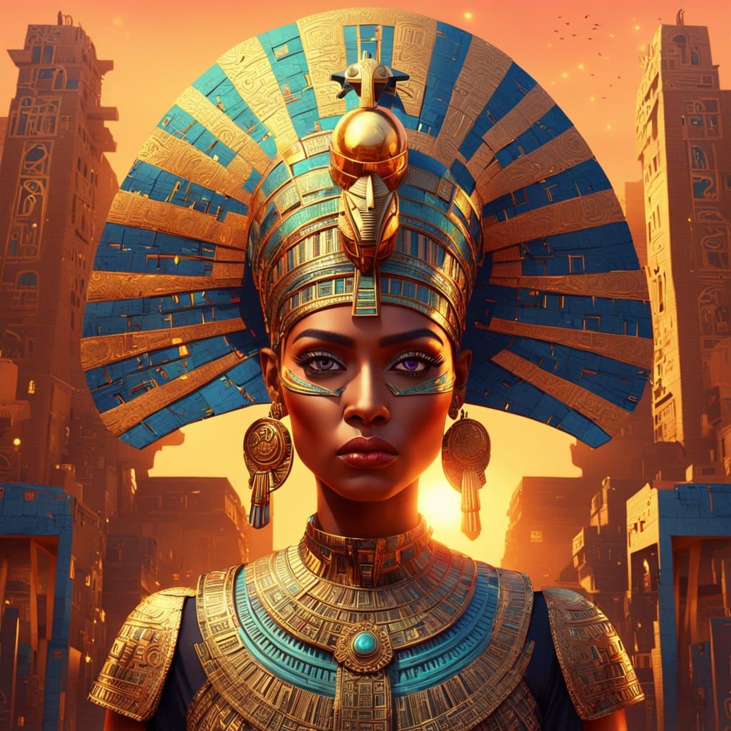 This image shows an Egyptian queen in a modern city, looking startled. The digital art combines ancient and modern elements with vibrant colors, a golden headdress, hieroglyphic patterns, and neon city lights.
