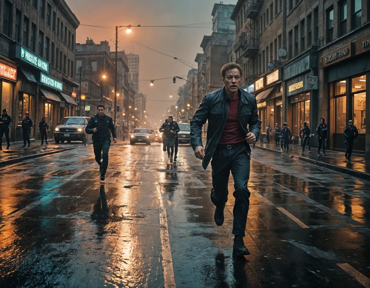 This image shows a man running through a city, pursued by police. The scene is presented as a cinematic still, with film grain, dramatic lighting, and a color-graded, post-processed look.