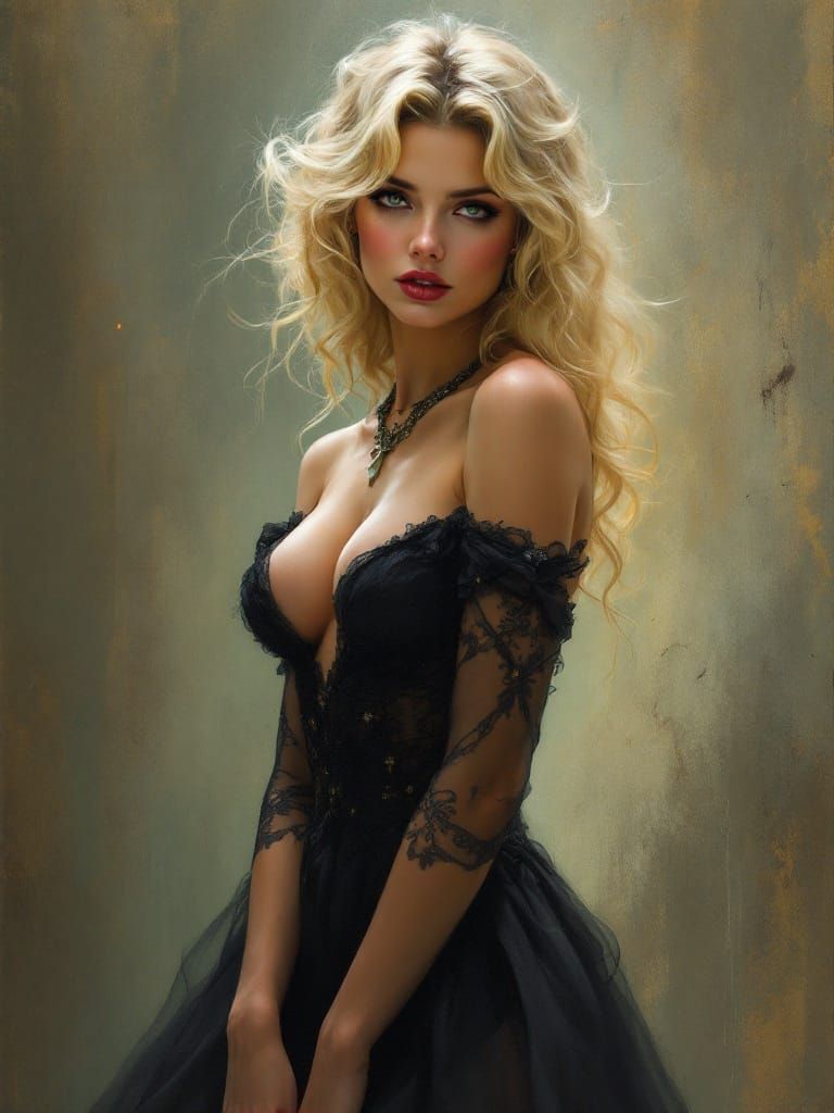 This image shows a full-bodied, blonde pin-up woman from the 1950s. The portrait features idealized naturalism with soft edges and an atmospheric background. Harmonious colors create depth in this vintage-inspired oil painting.