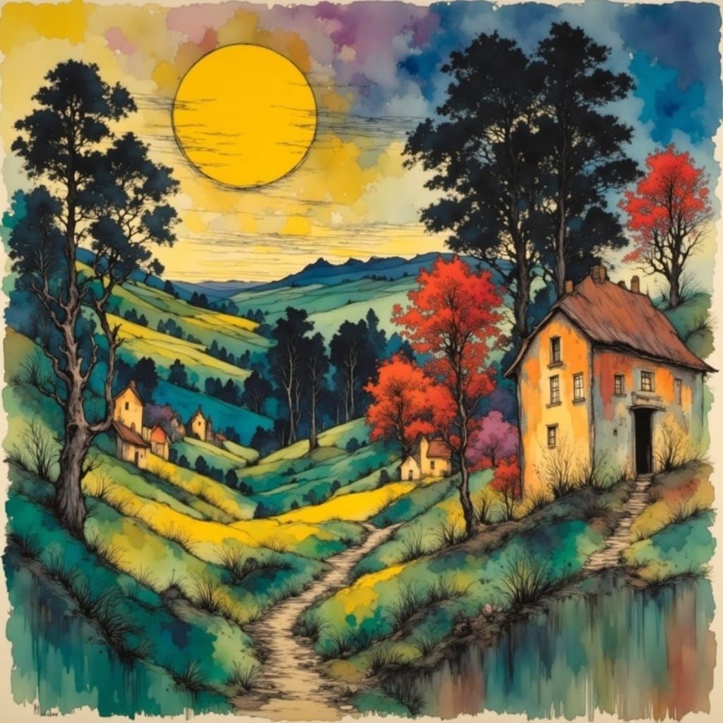 This image shows a surreal, dreamlike landscape with vibrant colors and distorted forms, reminiscent of Expressionist and Abstract styles.