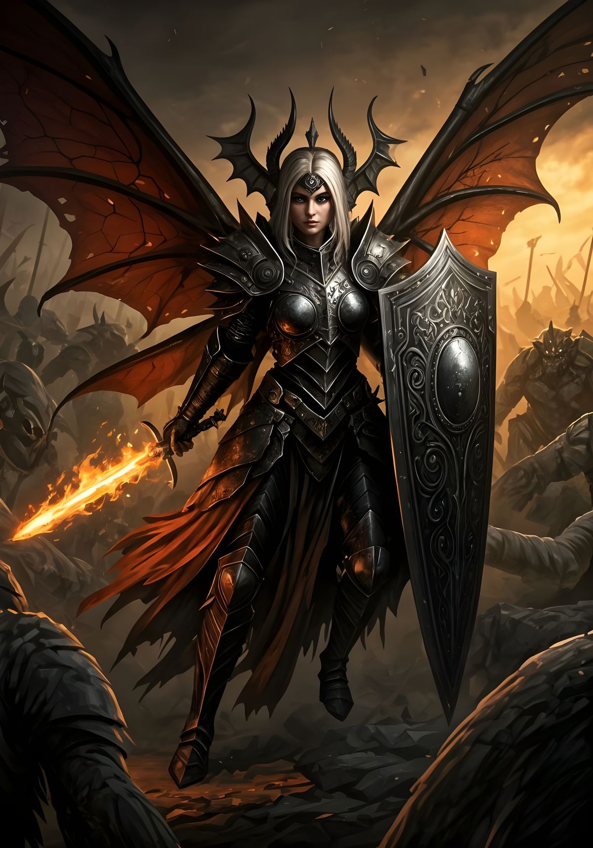 This image shows a dark fairy warrior in black and anthracite armor, wielding a flame sword and shield. The digital painting in a fantasy style features matte colors with gold, blue, and red hues.