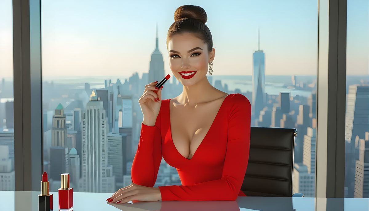 This image shows a striking close-up of a model at her desk, city skyline visible through the windows. She holds lipstick, wearing red spandex and stilettos, as a magazine ad.