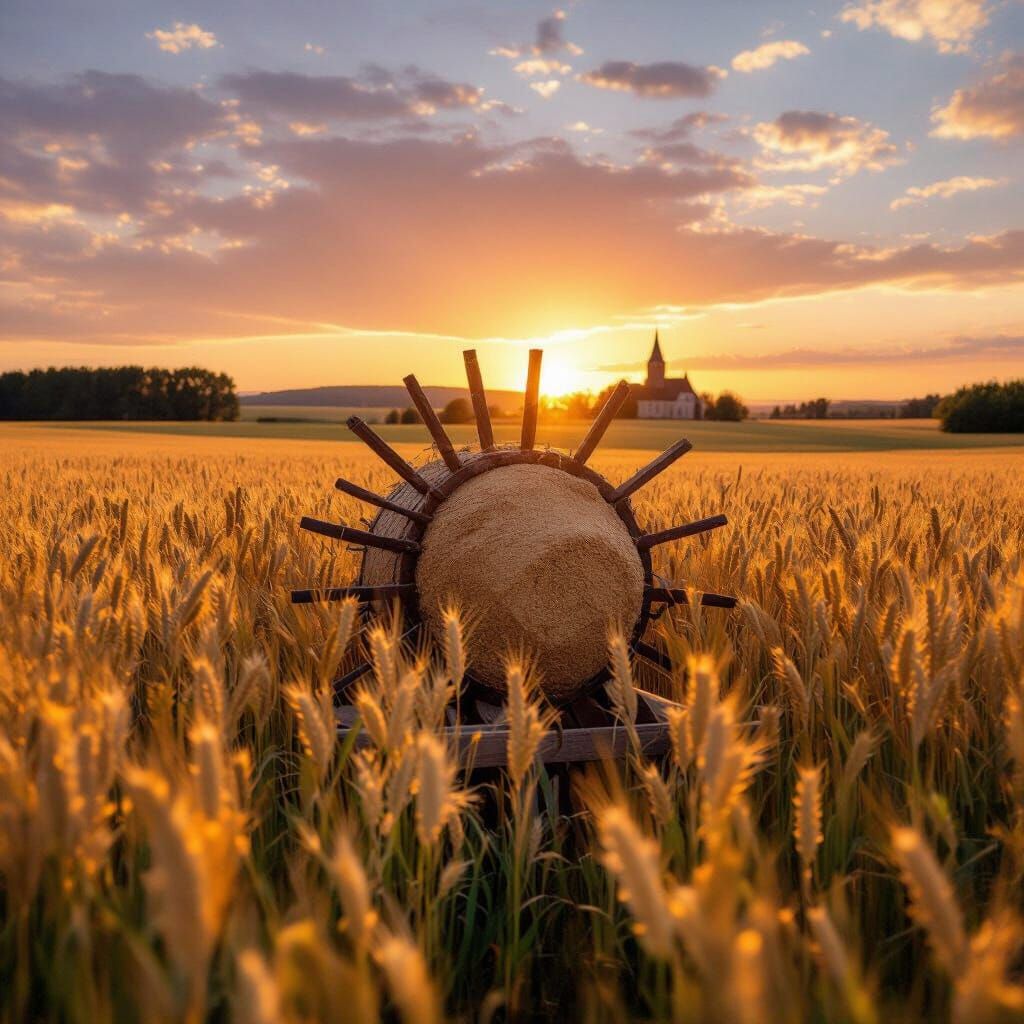 This image shows a weathered, twelve-spoked millstone in a golden wheat field at sunset. A medieval church with a stone spire stands in the distance, rendered with impressionistic photorealism.