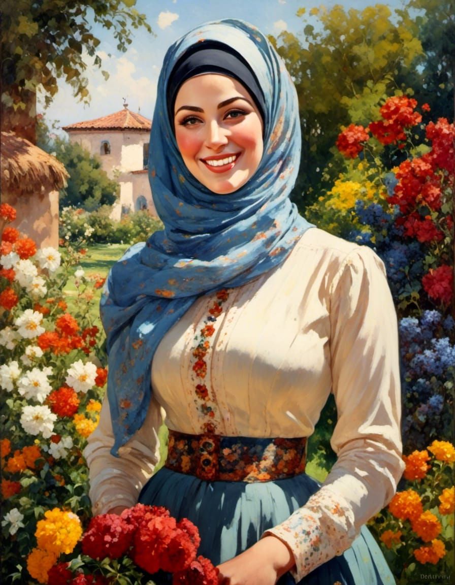 A beautiful image of a smiling, curvy woman in a hijab and modest dress, standing in a lush garden. The artwork has an oil-guache painting aesthetic with detailed floral elements.