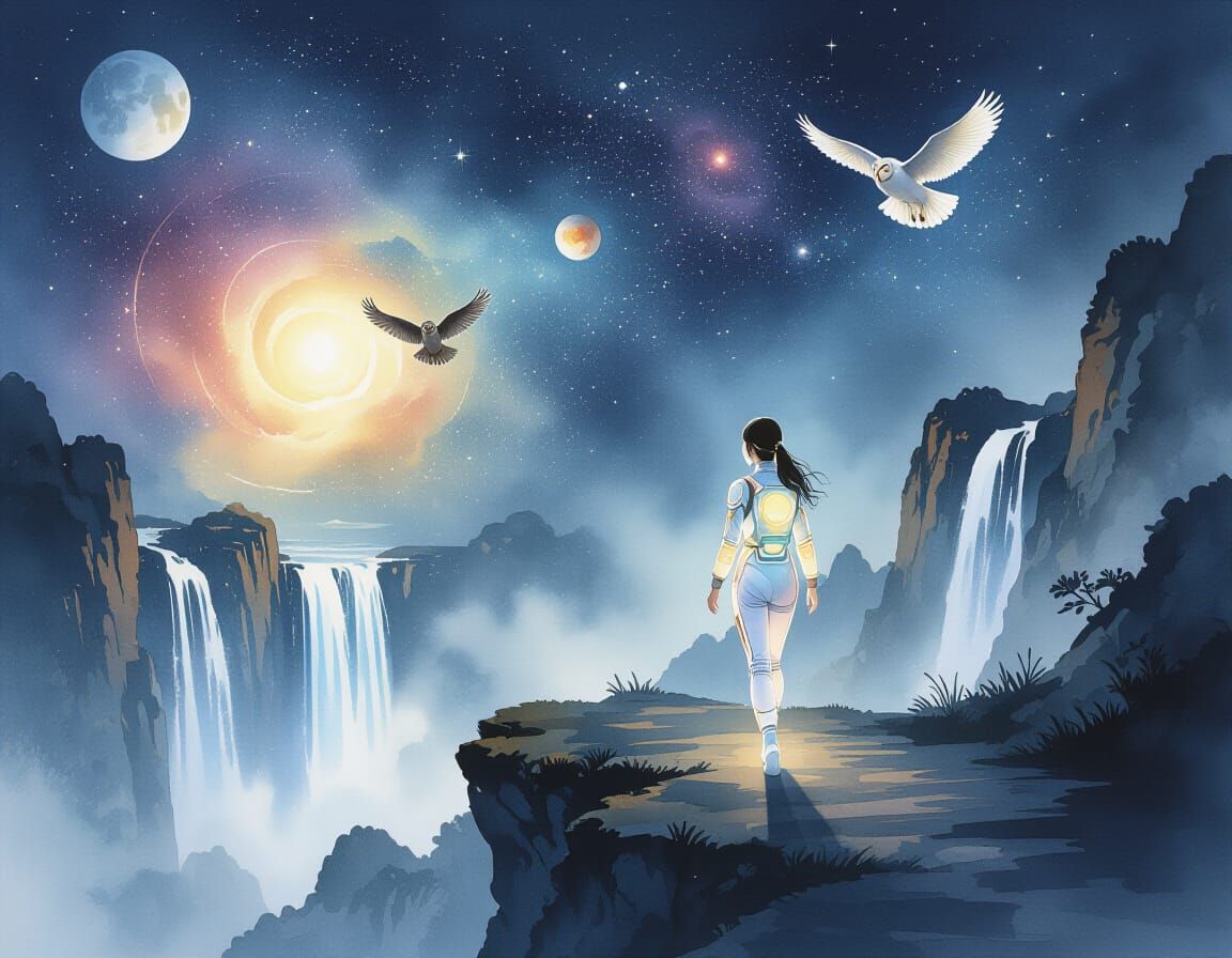 This image shows a woman in a spacesuit walking on a cliffside path with a waterfall. The sky is filled with stars and galaxies in a maximalist Chinese ink painting style.