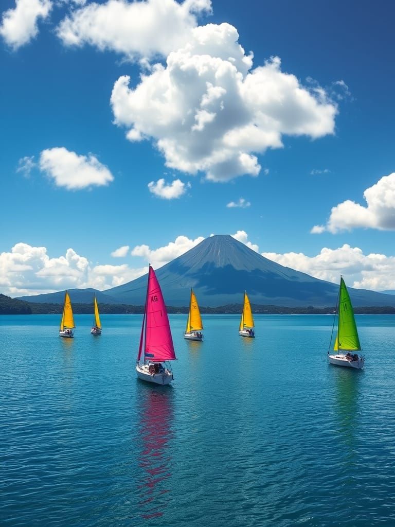 This image shows a tranquil Lake Arenal with sailboats and colorful sails. The art style is reminiscent of realistic cinematic lighting and saturated colors, under a blue sky with a volcano in the background.
