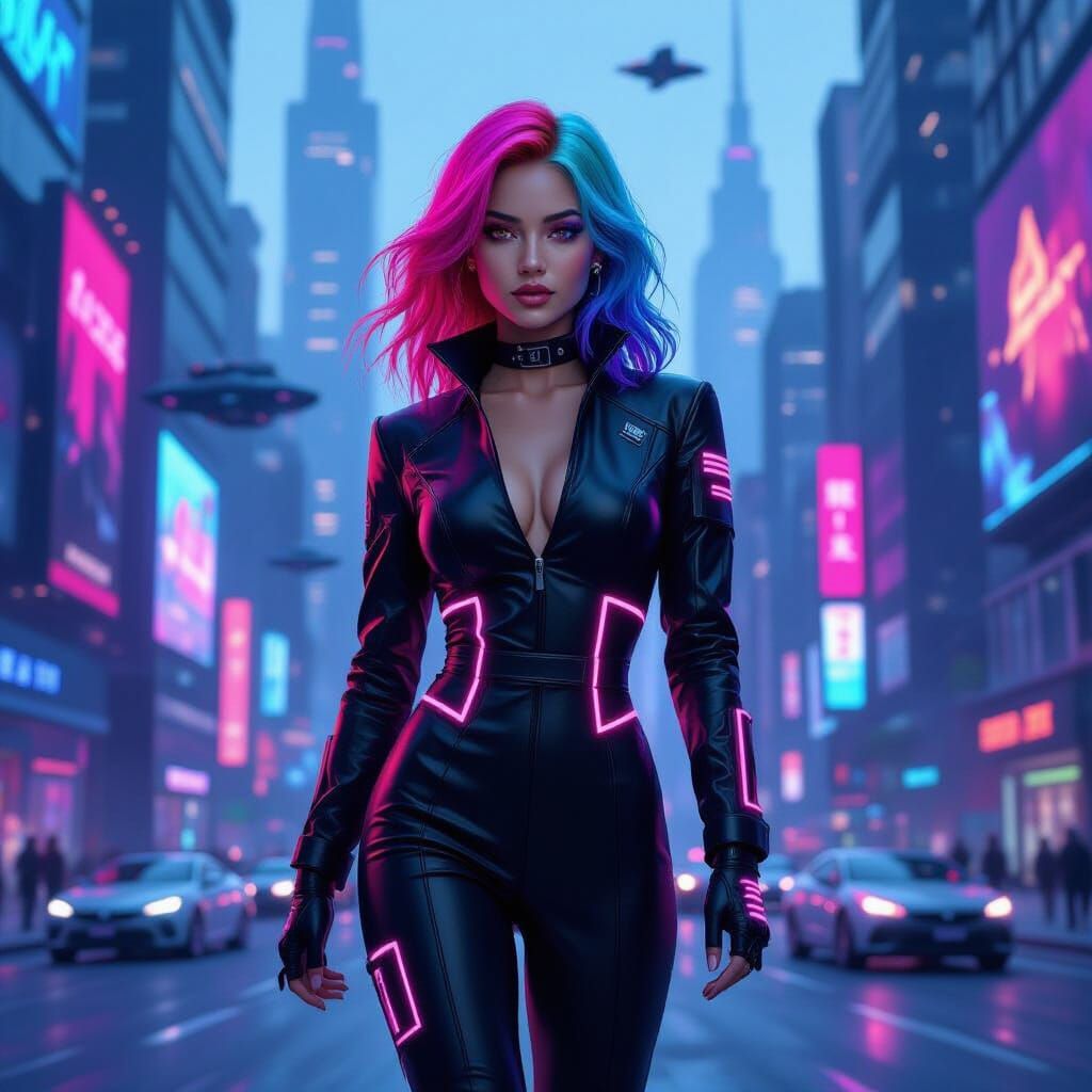 This image shows a woman with multicolored hair walking through a futuristic city at night. The image is rendered in a hyperrealistic cyberpunk style with electric blues, pinks, and purples.