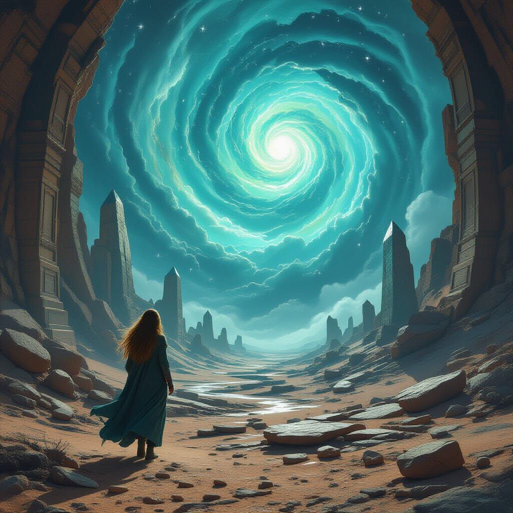 This hyperrealistic digital painting shows a lone explorer finding an ancient, overgrown alien temple on a desolate world. Crystalline structures and a swirling sky evoke isolation and wonder.