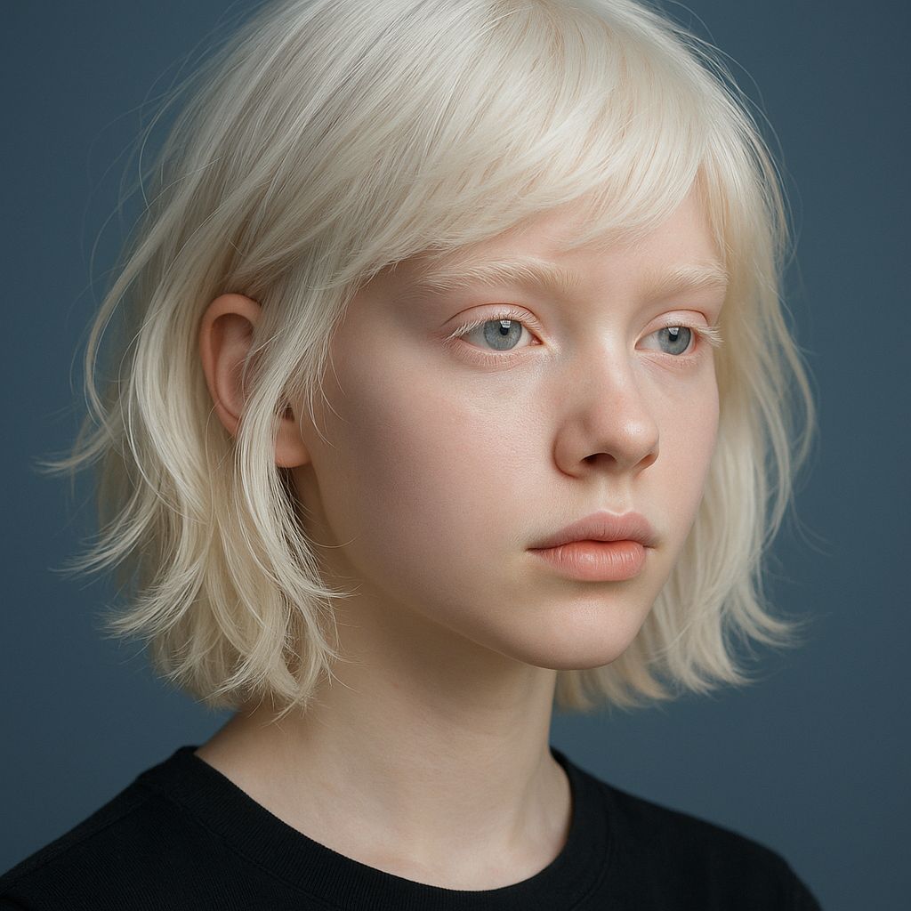 This image shows a photorealistic portrait of a beautiful, young albino girl with gray eyes and snow-white hair. The girl has porcelain skin, soft lips, and a delicate nose, set against a blue backdrop.