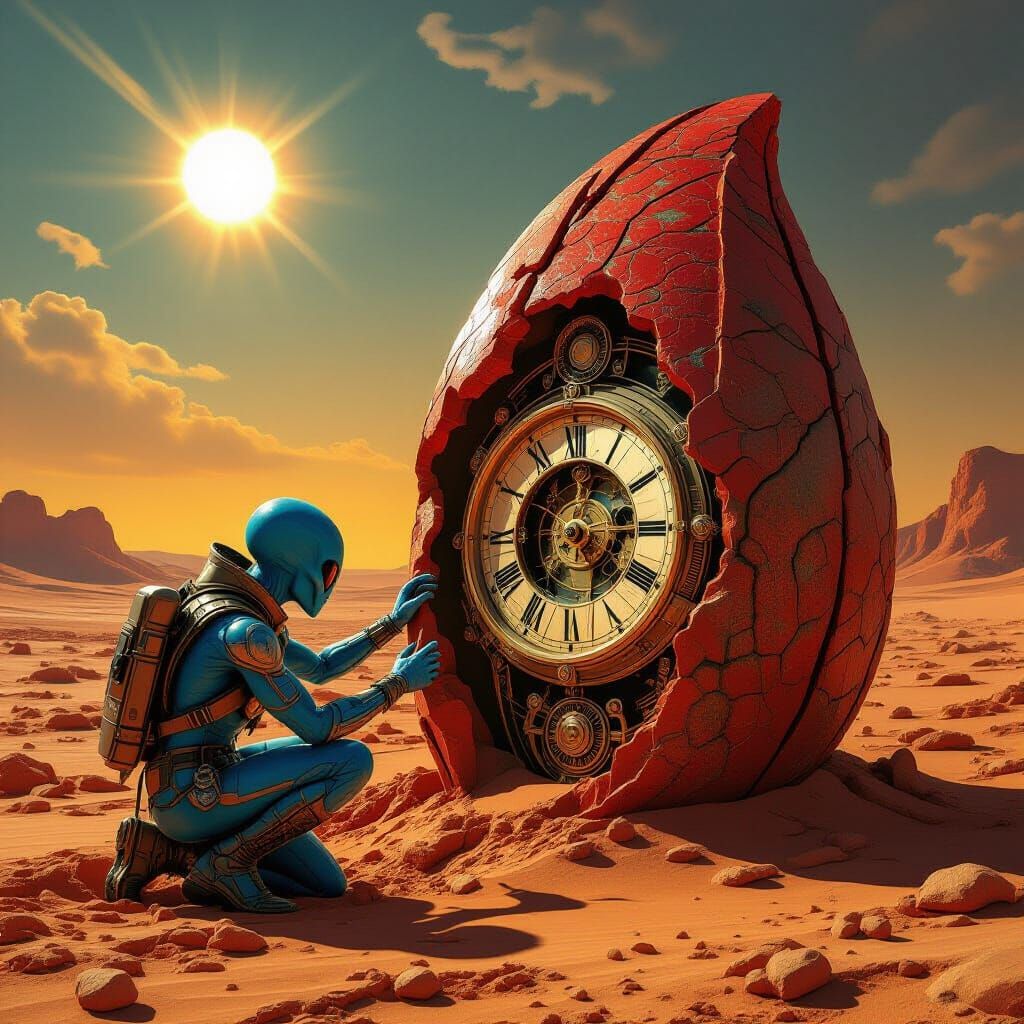 This image shows a blue alien archaeologist discovering an ancient grandfather clock artifact in a fossilized alien plant. The scene is a desolate desert with twin suns, rendered in a cinematic digital matte painting style.