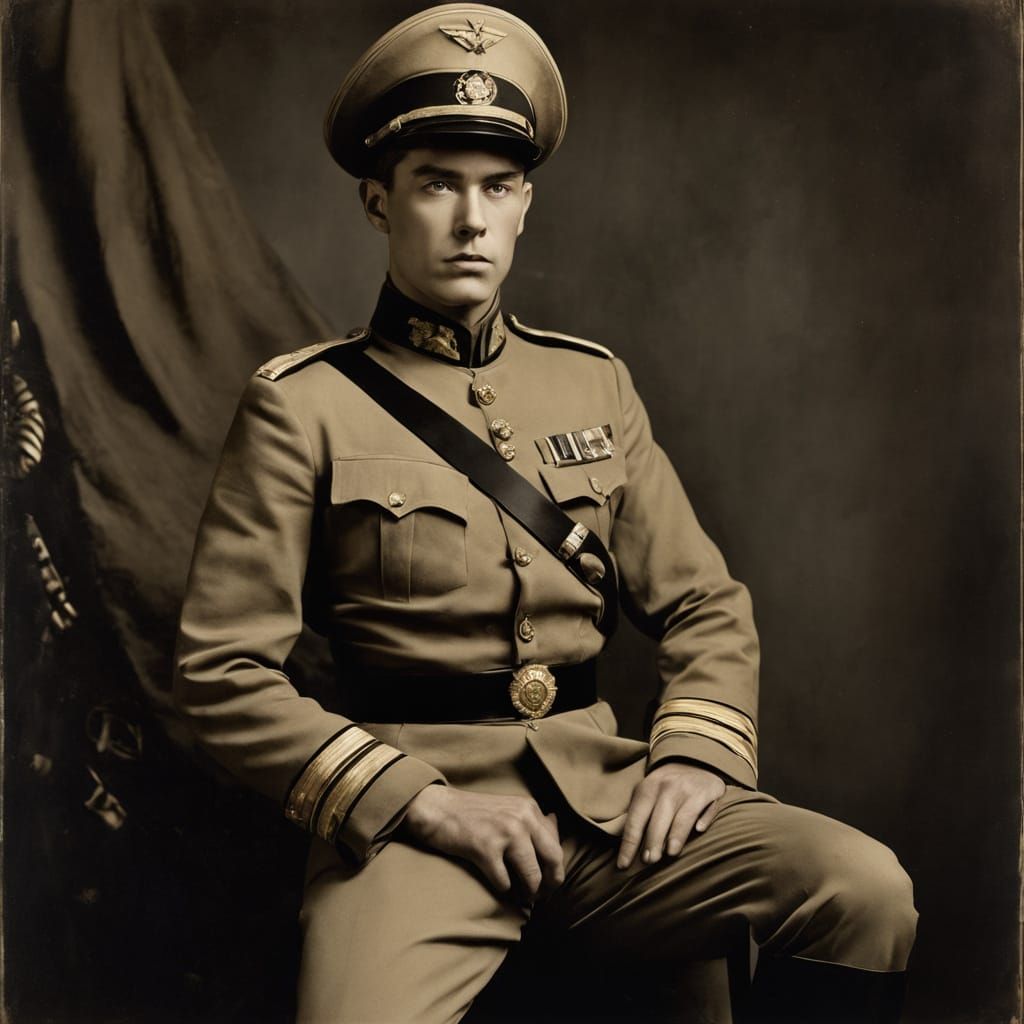 This image shows Captain Elliot Spencer in a khaki uniform, rendered in a vintage photography style. The picture features dynamic lighting, art deco elements, and moody dark academia aesthetics.
