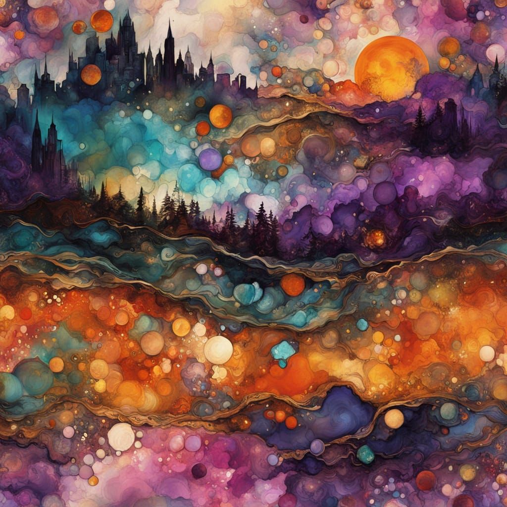 A vibrant landscape showing animals with long curly hair, short flowers, and trees in the distance. The image blends kintsugi mosaic design with alcohol ink and thick textured encaustic impasto, in a colorful glossy neon sunset.