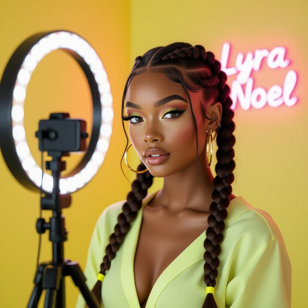 This ultra-realistic 8K photo captures a playful influencer space with vibrant lemon yellow and hot pink LED walls. Features include a ring light, tripod, and a glowing "LYRA NOEL" neon sign.