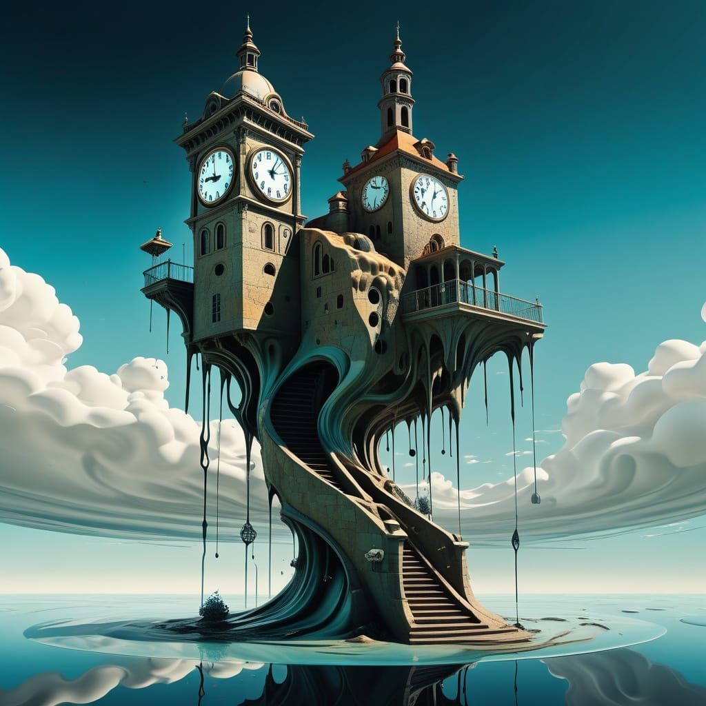 This image depicts a surreal dreamscape with a melting clock tower, rendered in a warped, dreamlike perspective reminiscent of Dali's art.