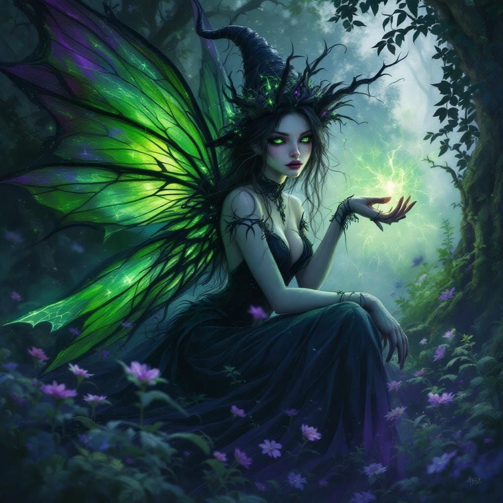A striking picture of a beautiful witch fairy with a pointy nose and ombre wings. She wears a dark dress and is surrounded by a mystical aura in a whimsical forest, rendered with intricate details.