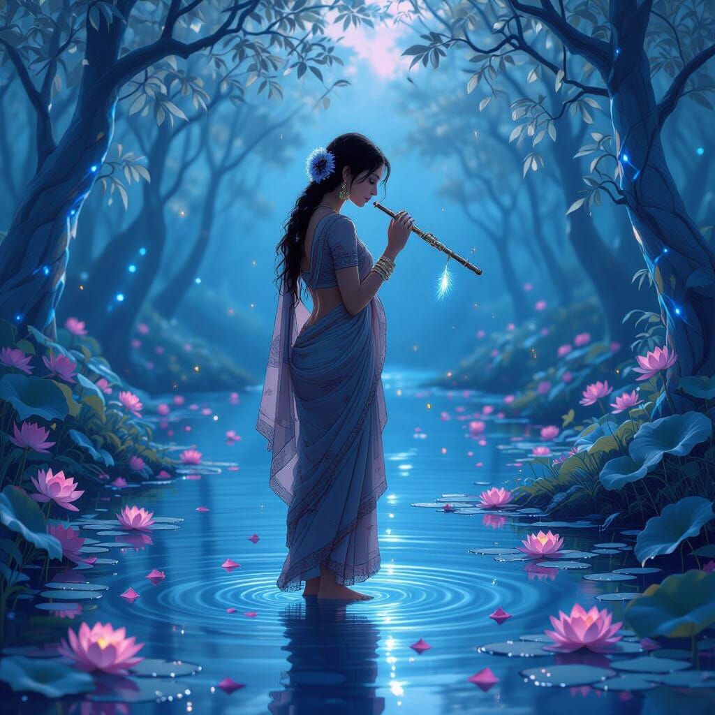 This image shows a barefoot woman in a saree standing by a lake in a surreal forest. The scene, in an anime-realism hybrid style, features glowing colors, lotus petals, and a floating flute.
