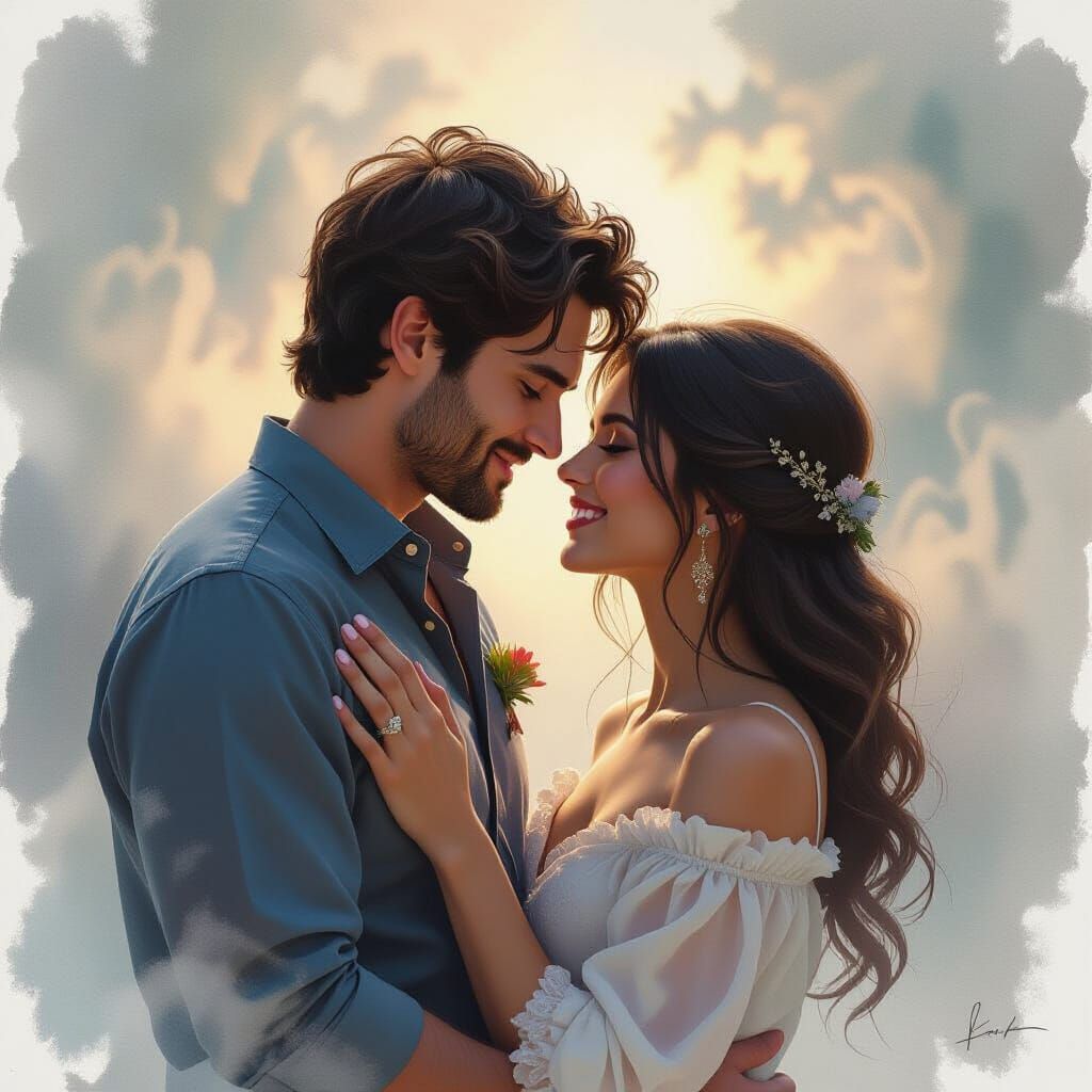 A charcoal drawing of a man expressing love in a misty, ethereal setting. The artwork combines warm, inviting light with intricate details and vibrant colors, as impasto painting.