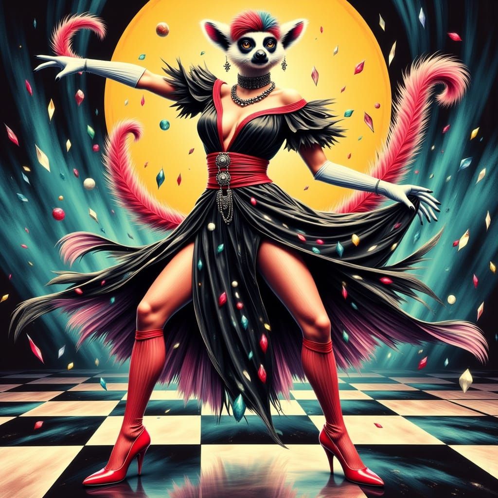 This image showcases a stunning anthropomorphic lemur hybrid in a glamorous flapper dress, executing a daring mid-twirl on a checkerboard dancefloor, surrounded by dynamic shapes and lines, evoking the spirit of 1940s swing dance and pulp comic posters.