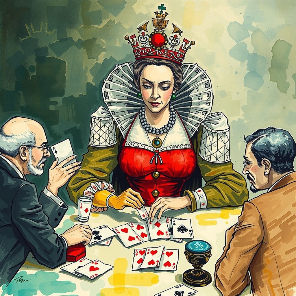 "Queen PLAYING canasta, surrealism, ink and watercolors, MEN'S card club, PICASSO, Brosmind, IMPRESSIONISTIC"