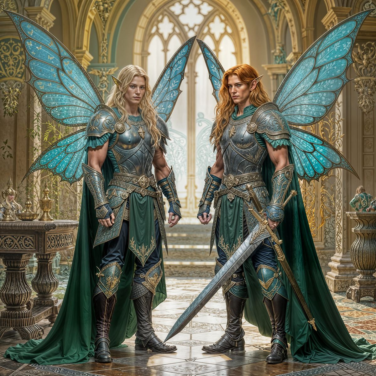 This image shows two male fairies in a hall, one with blonde hair and one with red. They have blue and gold wings, wear green capes and carry claymore swords. The aesthetic is digital fantasy art.