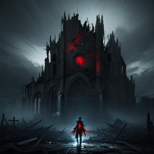 A striking picture of a demon boy screaming in agony inside a ruined church. The anime-inspired 3D art features glowing red eyes, tattered robes, and ominous shadows in low-key lighting.
