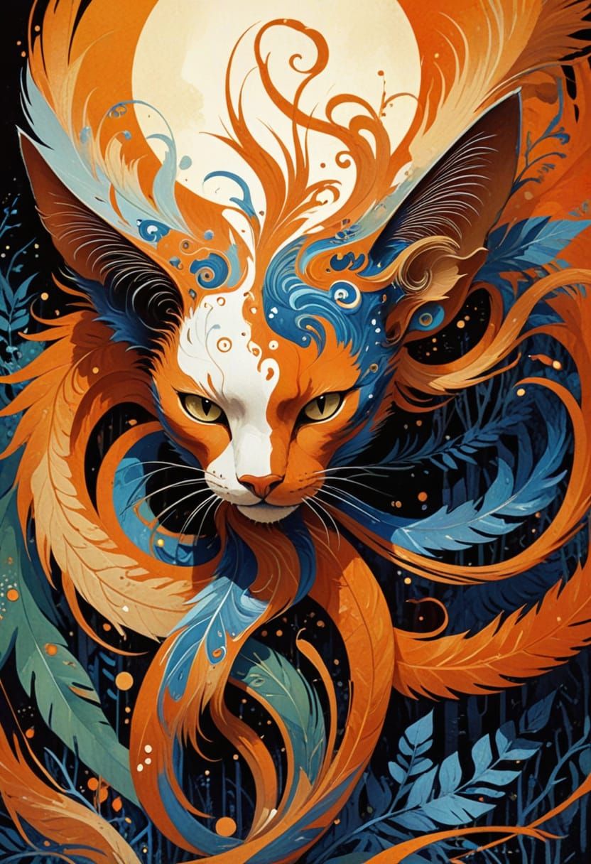 A close-up image of a surreal cat with a long neck and tail in a mystical forest, rendered with intricate orange and blue patterns in a fluid, dreamy art deco style.