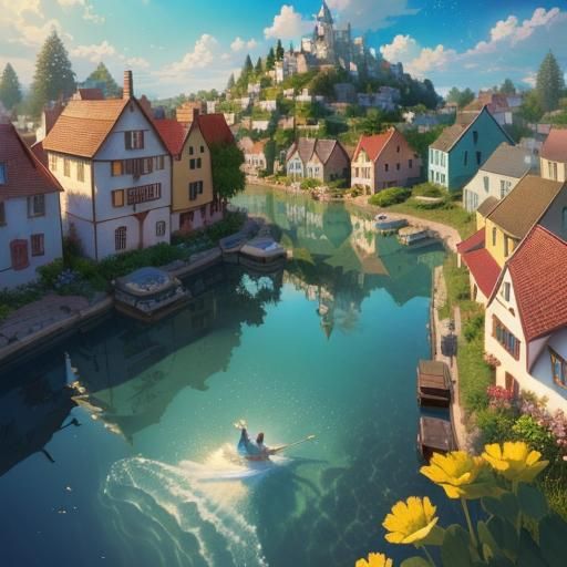Jesus making miracle on water, a tilt shift photo, inspired by Filip Hodas, polycount contest winner, sunlight and whimsical houses, blurred and dreamy illustration, super detailed picture, quaint villages in background
